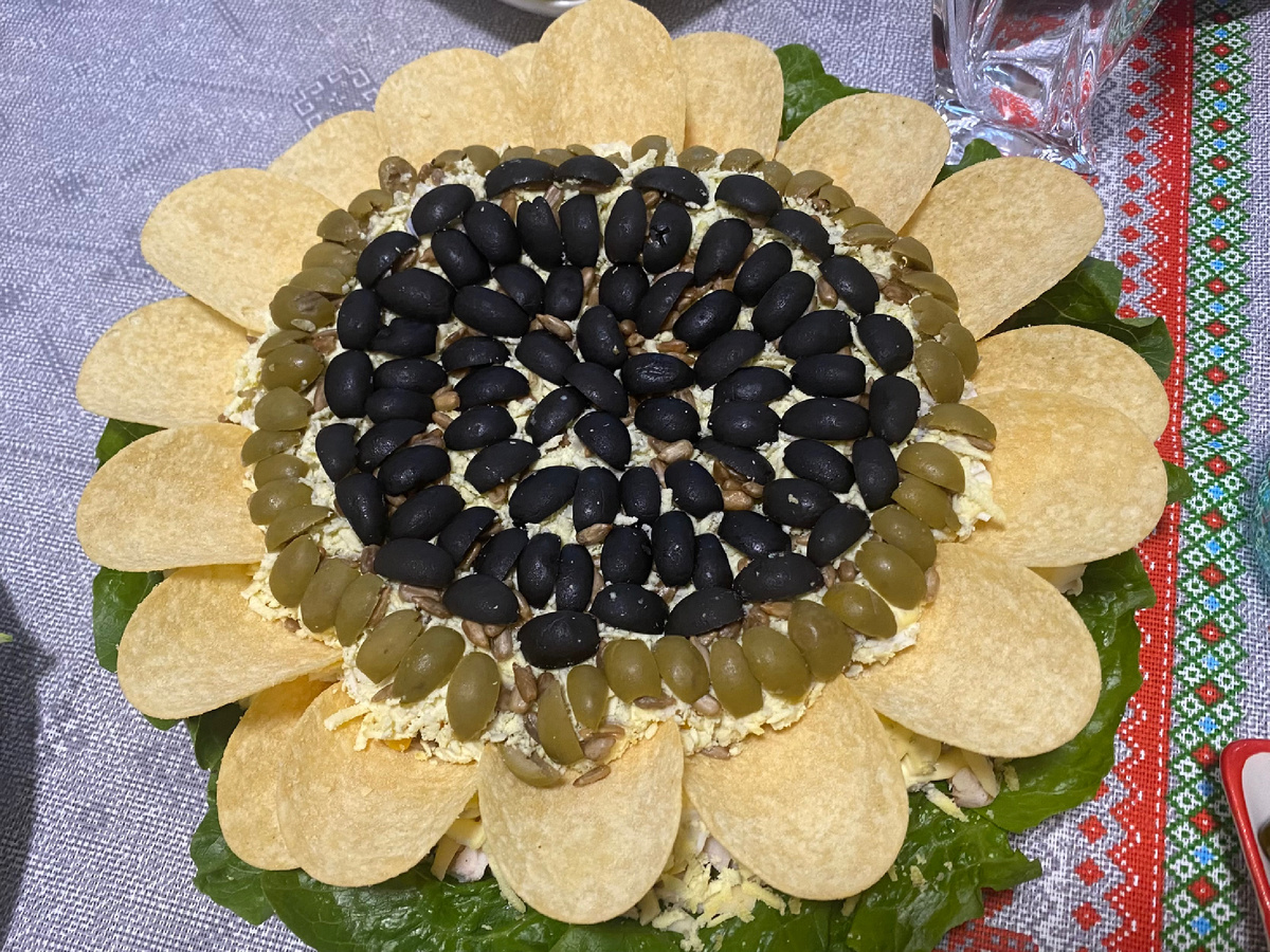 Вчера начали репетицию новогодних салатов))) На самом деле, конечно, просто собирались всей семьей в расширенном составе четырех поколений - прабабушка и правнучка за одним столом! Повод был прекрасный, поэтому застолье было не менее широким, чем состав присутствующих. Очень давно я не готовила слоеные салаты с каким-либо украшением, но на детских днях рождения они у нас частенько были в меню. И вот вчера я их приготовила. «Подсолнух» с копченой куриной грудкой, «Гнездо глухаря» с отварным языком, трубочки из ветчины с сыром/чесноком и «Морской» со слабосоленой неркой, авокадо и рукколой. Так, оказывается, приятно было приготовить все это и, конечно же, съесть))) Ещё было заливное (куда ж без него за праздничным столом?) и горячее (свиные медальоны с томленой айвой и вялеными сливами) Репетиция прошла успешно))) но вот на Новый год надо что-то другое будет готовить, вспомню ещё какие-нибудь свои проверенные годами рецепты.