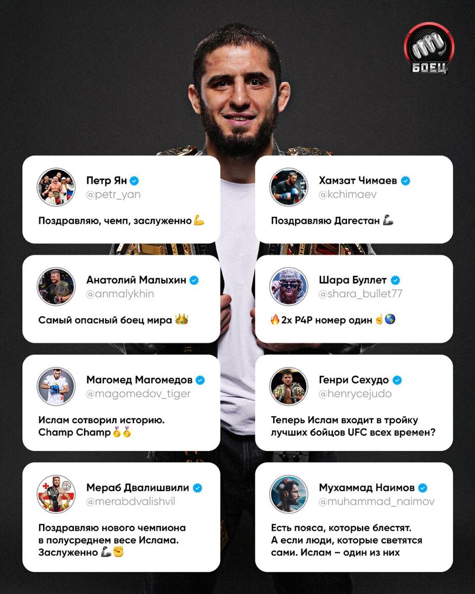 Махачев принимает поздравления от других бойцов 🏆🤩 Исторический момент. Так выглядит величие: 🤩 взял второй пояс в UFC. Первый боец из России, который смог завоевать второй титул; 🔥 одержал шесть побед в титульниках; ⚡️ стал вторым бойцом в истории UFC, который смог одержать 16 побед подряд в лиге; 💥 оформил 11 досрочек в UFC; 💪 не проигрывает больше 10 лет; 🔝 602 возглавлял рейтинг Р4Р. Ждем, что Ислам вернется на первую строчку на следующей неделе!