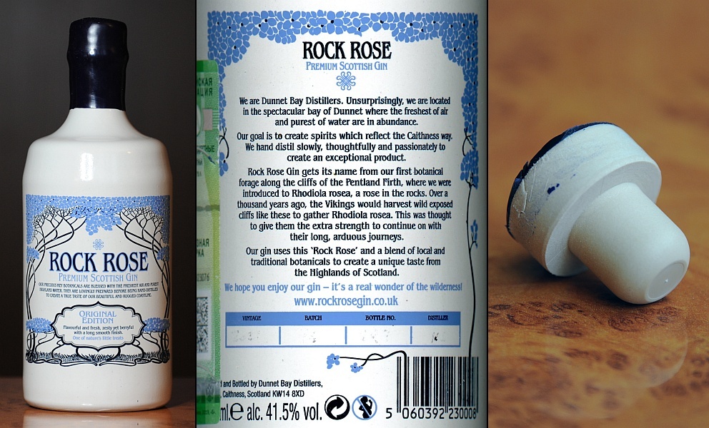 Продолжаем знакомиться с джинами. Обзор от моего друга El_gorra (текст и фото автора, ссылка на оригинал в конце обзора). Dunnet Bay Distillers Rock Rose Premium Scottish Gin Original Edition. Ещё один шотландский джин, явно претендующий на оригинальность (и не только в названии). Действительно броское оформление начинается с "керамической" бутылки цвета с не менее оригинальными "этикетками", на самом деле это –