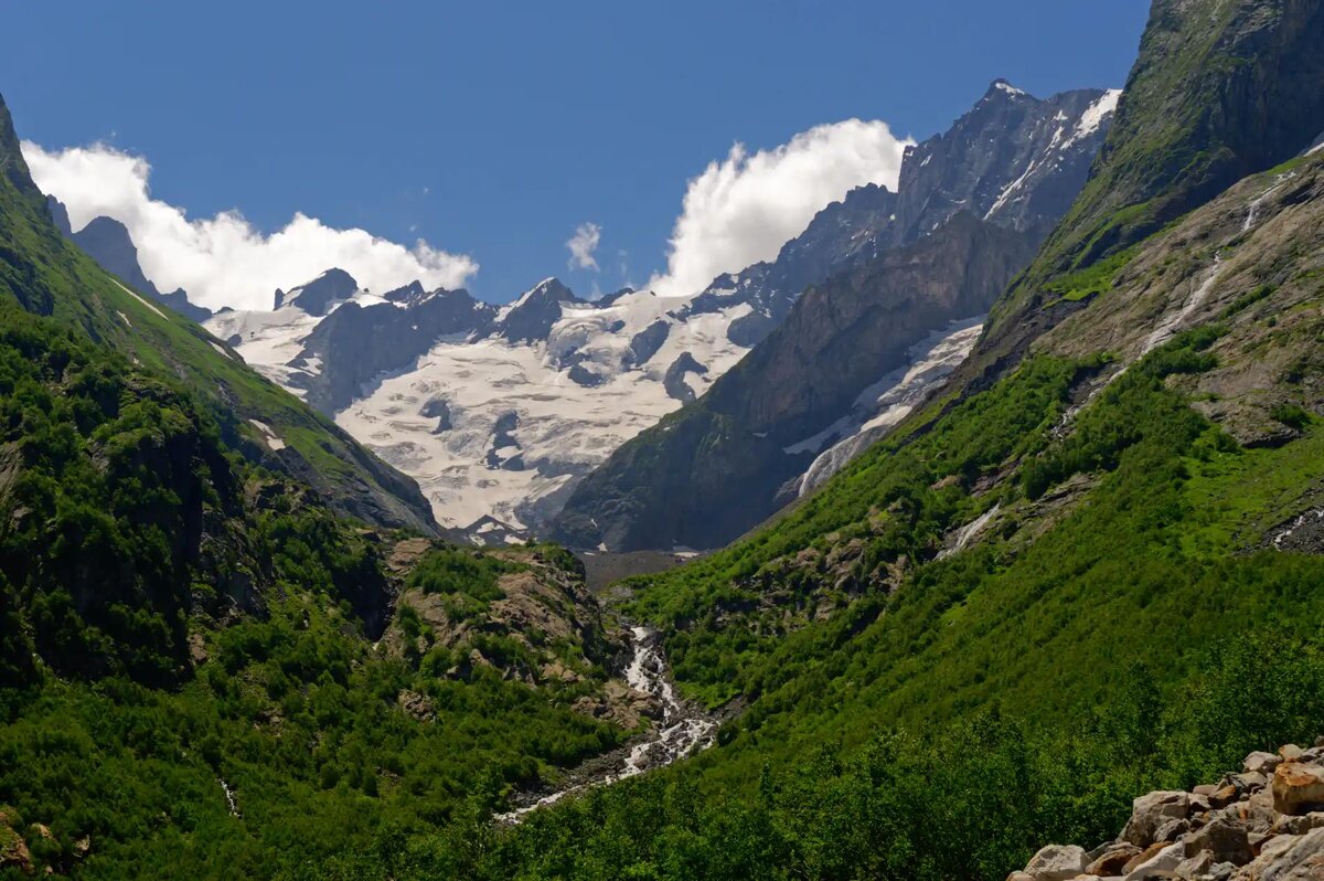 Подошли ближе к горе Домбай-Ульген, и тут вода слышна уже основательно, грохочет, будто кто-то забыл выключить кухонный кран гигантских размеров. Тропа петляет среди зарослей, время от времени кто-то уходит чуть вбок посмотреть на мох, потрогать кору или просто снять усталость
