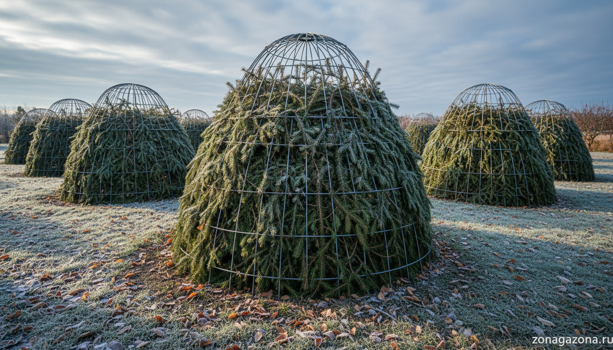 Пригибание и укрытие нетканым материалом. Часто применяют для плетистых сортов. Побеги пригибают к земле, фиксируют и накрывают агроволокном. Такой способ хорошо сохраняет куст, но требует аккуратности, чтобы не сломать побеги.