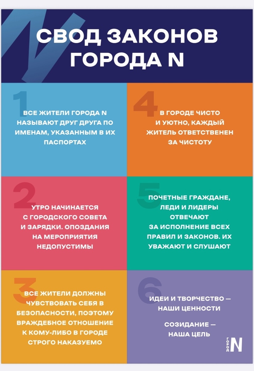 Свод законов в детском лагере "Город N" «Зачем платить за лагерь, если можно к бабушке отправить?» — этот вопрос я слышу чаще всего. Отвечаю честно: бабушка накормит, уберет за ребенком и уложит его спать. А мы дадим то, что останется с ребенком на всю жизнь — то, что называют сейчас мягкими навыками. умение работать в команде и не бояться сцены. «Город N» — это не просто лагерь. Это модель общества (своя республика), где дети создают законы, дети зарабатывают внутреннюю валюту, учатся жить по правилам, которые придумали сами. 4 главных принципа, которые делают нас непохожими на обычные лагеря: 1. Не присмотр, а осознанное взросление • Ребенок научится выступать перед залом, даже если боится • Поймет основы финансовой грамотности через игровую валюту • Найдет свое место в команде — не «отличник» или «тихоня», а лидер, художник или организатор 2. Цифровой детокс как возможность Мы не запрещаем гаджеты - мы возвращаем детей в реальный мир. После смены они начинают использовать техноло