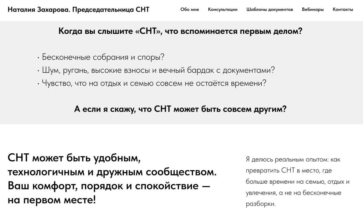 Я люблю делать полезные для СНТ-вселенной вещи! Сегодня хочу поделиться с вами своей важной новостью: у меня наконец появился сайт, посвящённый работе председателей СНТ. Этим и занималась в последние несколько недель. 🔹 Здесь я собрала всё о себе — кто я, чем занимаюсь и как могу быть полезна и начинающим, и опытным председателям. 🔹 Для вас — – Постоянные ссылки на вебинары: всё в одном месте, удобно возвращаться или советовать коллегам. – Возможность записаться на консультацию ко мне. – Шаблоны документов для работы председателя — со свежими образцами и пошаговыми мини-инструкциями. За этот год я уже помогла нескольким председателям разобраться в сложных ситуациях. Всегда стараюсь отвечать подробно, делиться опытом, направить — или рассказать, где и у кого ещё можно поискать совет. Очень приятно получать благодарности за подсказки — и это мотивирует делать больше 💚 Очень помогли Ваши подсказки для оформления документов. Спасибо огромное! Просто пошаговая инструкция по вариантам. Ос