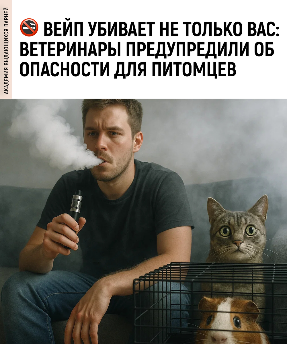 Ветеринары предупреждают: курение электронных сигарет в квартире может быть смертельно опасным для домашних животных. Испарения вызывают аллергию, кашель и удушье. Особенно опасны ароматизаторы с цитрусом — они оседают на слизистых и лапах питомцев. По словам врача Михаила Шелякова, при нагревании глицерин и пропиленгликоль выделяют акролеин — тот самый токсин, который есть в тормозной жидкости. Больше всех страдают животные в клетках — хомяки, крысы и морские свинки просто не могут сбежать от дыма.