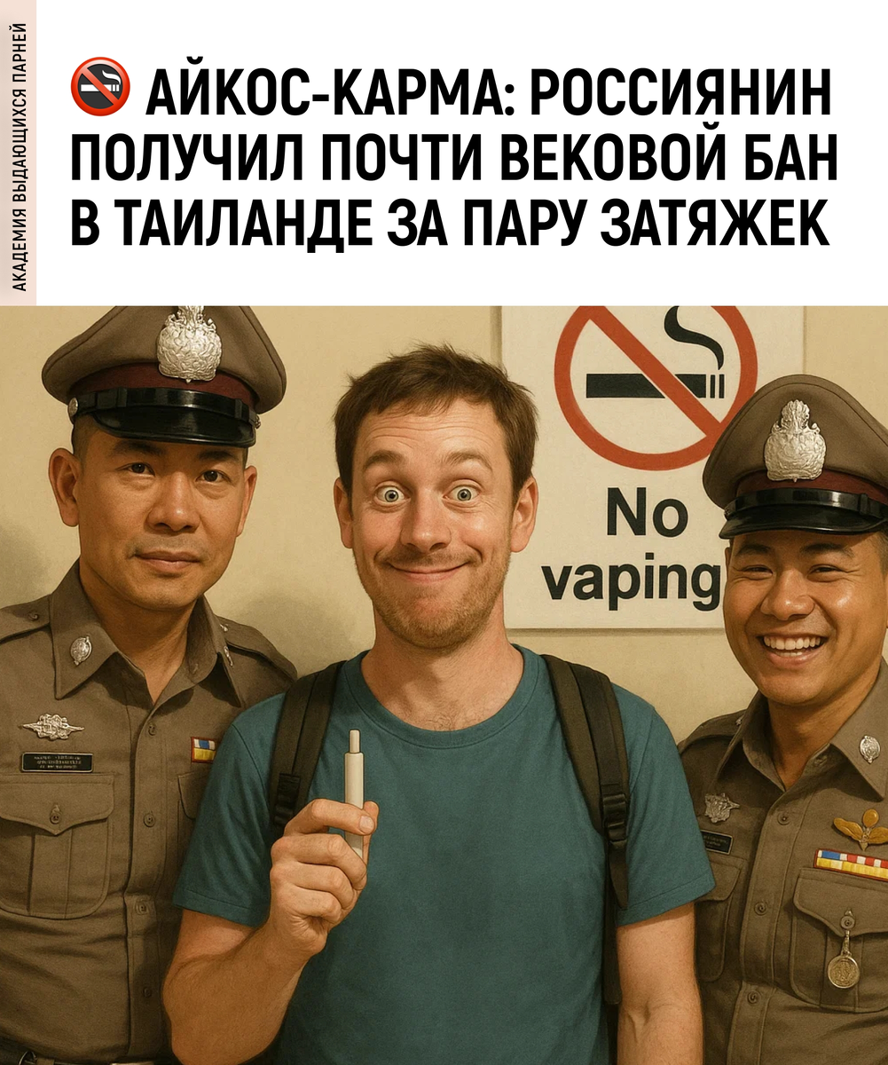 Российский турист решил подымить айкосом… в буддийском храме. Местные полицейские оценили «просветлённость» поступка и оформили задержание на месте. Теперь ему грозит 99 лет без шансов на отпуск в Тае — а всё из-за закона, который запрещает любые вейпы и электронки. Когда говорили «улетай в Таиланд, отдохни», никто не уточнял, что обратный билет может быть через девять десятков лет.