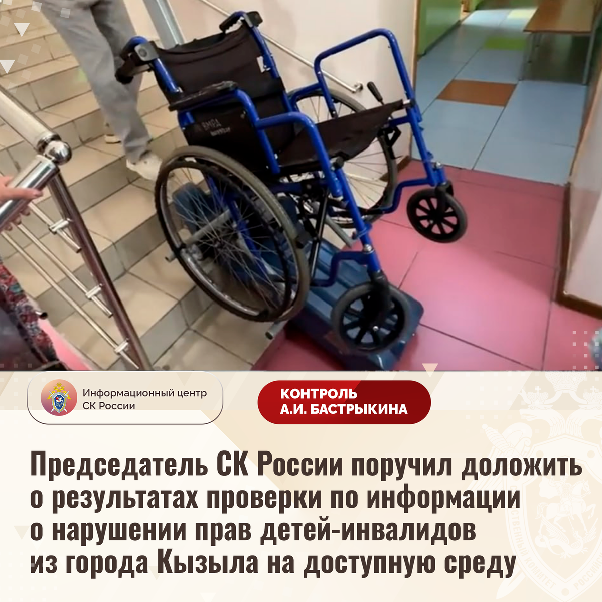 Председатель СК России поручил доложить о результатах проверки по информации о нарушении прав детей-инвалидов из города Кызыла на доступную среду В СМИ сообщается о нарушении прав детей-инвалидов из города Кызыла на доступную среду. На втором этаже Республиканского центра восстановительной медицины и реабилитации для детей расположены кабинеты психолога, массажиста и физиотерапевта, которые регулярно посещают несовершеннолетние с ограниченными возможностями здоровья. Однако лестничные марши здания не оборудованы пандусами, а специальное подъемное устройство расположено только в стационарном отделении и предназначено для использования медицинским персоналом. В результате родители вынуждены самостоятельно перемещать детей. В СУ СК России по Республике Тыве организована процессуальная проверка. Председатель Следственного комитета Российской Федерации Александр Иванович Бастрыкин поручил руководителю СУ СК России по Республике Тыве Константину Владимировичу Столбину доложить о ходе и резул