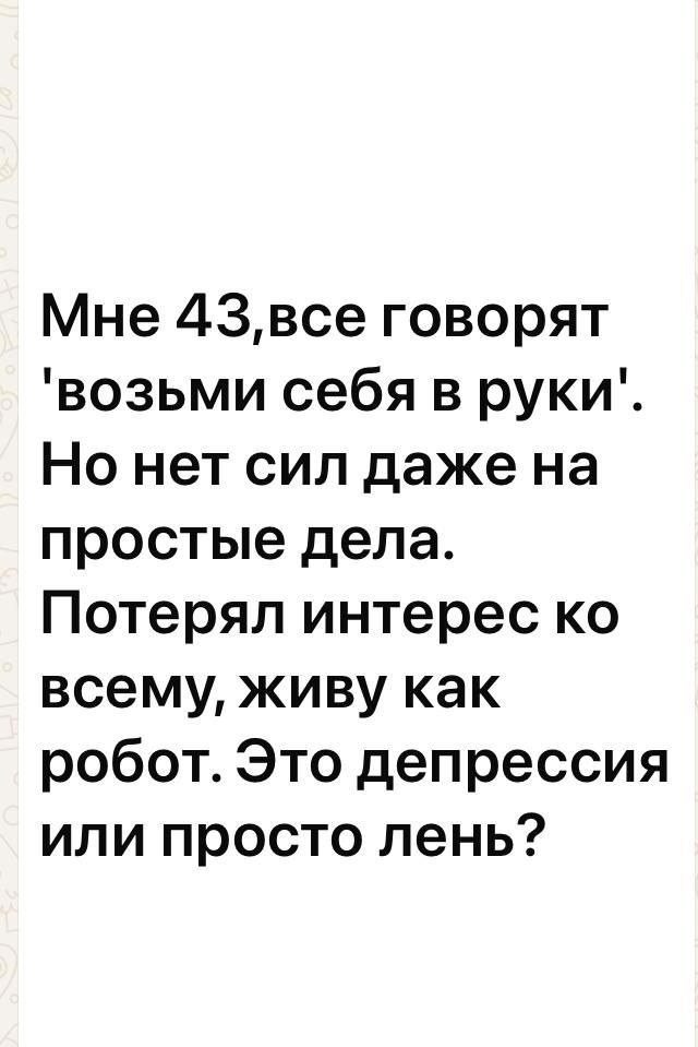 🔥 Вы действительно считаете, что мужчина в 43 года может просто "облениться"? Ваши симптомы — "нет сил", "живу как робот" — классические признаки выгорания и скрытой депрессии. 🔴 Что стоит за вашими словами: ❗️"Возьми себя в руки" — социальный миф, что мужчина должен справляться молча ❗️ "Нет сил" — истощение нервной системы, а не недостаток воли ❗️"Живу как робот" — эмоциональное выгорание после лет подавления чувств 🔵 План терапии: 1. Диагностика (1-2 сеанса) — оценим уровень выгорания и исключим медицинские причины 2. Восстановление ресурса (4-5 сеансов) — техники работы с тревогой и апатией 3. Пересмотр жизненных приоритетов (3-4 сеанса) — находим новые смыслы 💪 Прогноз: Через 2-3 недели: вернется энергия для базовых дел Через 1.5 месяца: появится интерес к хобби и общению Через 3 месяца: сформируется устойчивое эмоциональное состояние Если не работать над собой: рискуете получить клиническую депрессию, проблемы со здоровьем и полную потерю жизненных перспектив. ❗️Шаг к свобод