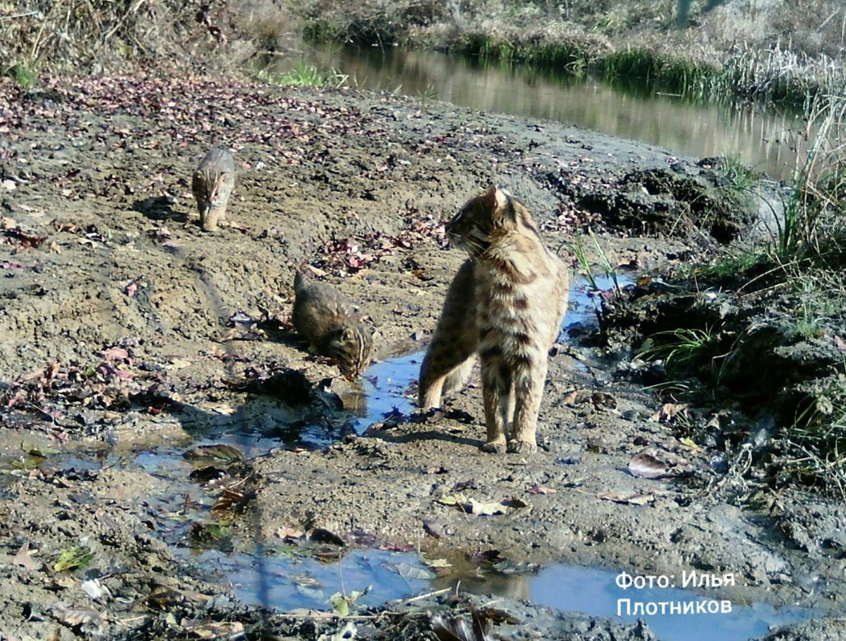 Редкие снимки позднего осеннего выводка дальневосточного лесного кота получили учёные национального парка «Земля леопарда». На кадрах семейство ненадолго останавливается возле водопоя, отдыхает и изучает обстановку перед тем, как продолжить свой путь.