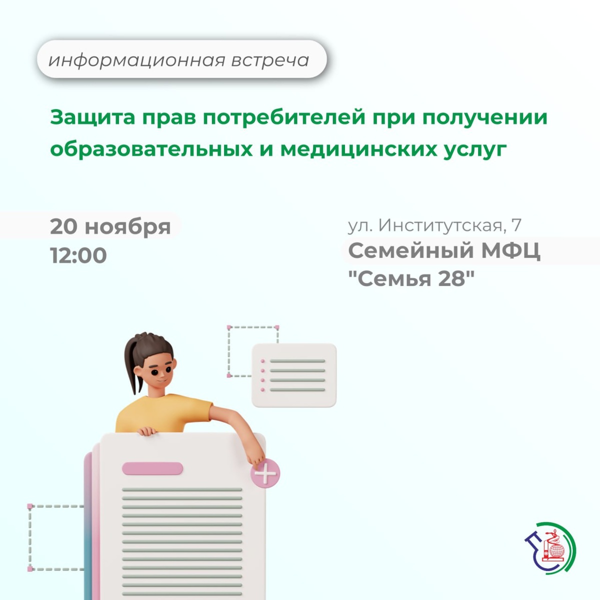 📣Приглашаем жителей и гостей Благовещенска на информационную встречу со специалистом Консультационного центра 20 ноября, 12:00 в Семейном МФЦ (ул.Институтская, 7) Тема встречи: защита прав потребителей образовательных и медицинских услуг Юрисконсульт ответит на вопросы: ➡️ об ответственности учебных заведений и мед.организаций ➡️ о том, как действовать при нарушении условий договора ➡️ куда обращаться за защитой своих прав ➡️ как составить претензию Необходима предварительная запись по телефону: 89240419203 #защита_прав_потребителей 🔬 @cge_amur