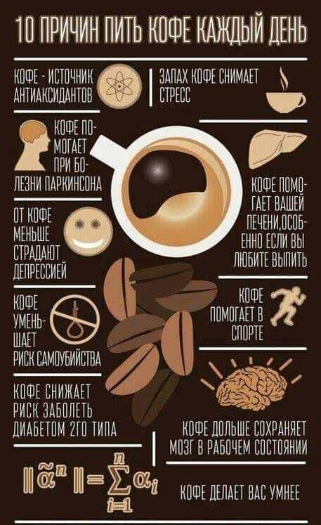 Кофе сейчас в моде. Стакан в руке из кофейни - это как статус. Я против выпендрежа , но очень люблю кофе. Настоящий, в зернах, молотый своими руками. Сваренный дома. Люблю проснуться раньше всех в доме, сварить себе чашечку кофе и спокойно посидеть полчасика , попивая этот напиток. Люблю пить кофе в компании, с детьми или подругами. Когда дом наполняется ароматом кофе, становится так уютно... Так вот, про кофе. Кофе — один из самых популярных напитков в мире, и его влияние на здоровье изучается десятилетиями. Вопрос его пользы и вреда не имеет однозначного ответа, так как эффект зависит от дозы, индивидуальных особенностей организма, способа приготовления и даже генетики. Вот сбалансированный взгляд на пользу и вред кофе. Польза кофе (при умеренном потреблении) 1. Повышение энергии и концентрации · Кофеин блокирует аденозин — нейромедиатор, отвечающий за чувство усталости. Это приводит к повышению уровня энергии, улучшению концентрации, внимания и настроения. 2. Стимуляция умств