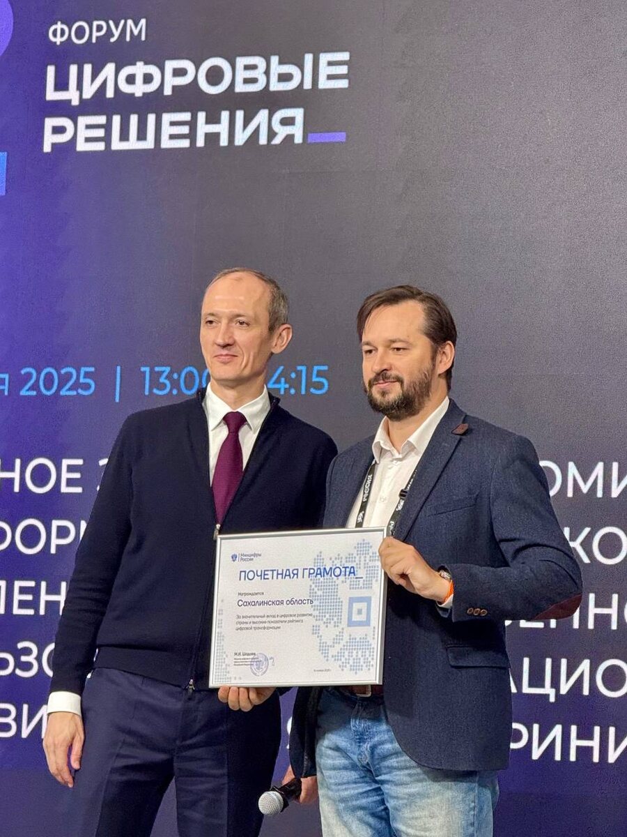 🔈Сахалин - лидер цифровой трансформации 🎖 Сахалинскую область отметили почетной грамотой на форуме «Цифровые решения» за значимый вклад в развитие страны и высокие показатели рейтинга цифровой трансформации Министерства цифрового развития и связи России. Регион получил специальную награду за успехи в реализации национального проекта «Экономика данных» и высокий уровень внедрения цифровых технологий. Заместитель председателя правительства РФ Дмитрий Григоренко подчеркнул роль регионов в повышении качества госуслуг и комфорта жителей через инновационные технологии. Сахалинская область сохраняет лидерство среди субъектов федерации уже три года подряд благодаря успешным инициативам и масштабному внедрению инновационных проектов. Под руководством губернатора Валерия Лимаренко регион добился серьезных результатов: 🔷 Повышен уровень внедрения современных ИТ-технологий и электронных сервисов. 🔷 Создана высококачественная телекоммуникационная сеть. 🔷 Обеспечена удобная подача заявок
