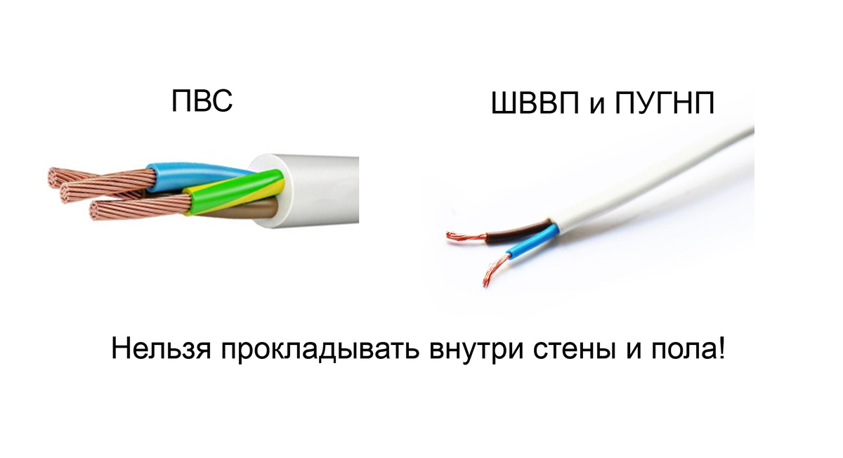 Мягкие провода - ПВС, ШВВП, ПУГНП и аналогичные, не являются пожаробезопасными, то есть их изоляция не тестируется на не поддерживание горения. Что такое не поддерживание? Это не значит, что провод не будет гореть - будет, но если убрать источник огня он должен погаснуть и, тем более, не передавать огонь дальше. Эти требованиям соответствуют кабели ВВГнг и NYM, а мягкие провода - нет. Их назначение - открытая проводка, например для удлинителей или шнуров приборов, а также в кабель-каналах. Если спрятать такой провод в стену может получиться так, что в распаечной коробке из-за плохого контакта начнётся возгорание и оно по проводу распространится по всему дому. Кстати, поэтому провод СИП не заводится в дом и щитки - у него изоляция из полиэтилена и она горит очень хорошо. Что же делать, если нам нужно проложить мягкий провод, но спрятать его в стену или стяжку пола? Вам поможет кабель КГВВнг - он стоит дороже ВВГнг, но зато отвечает требованиям пожарной безопасности. Спасибо, что дочит
