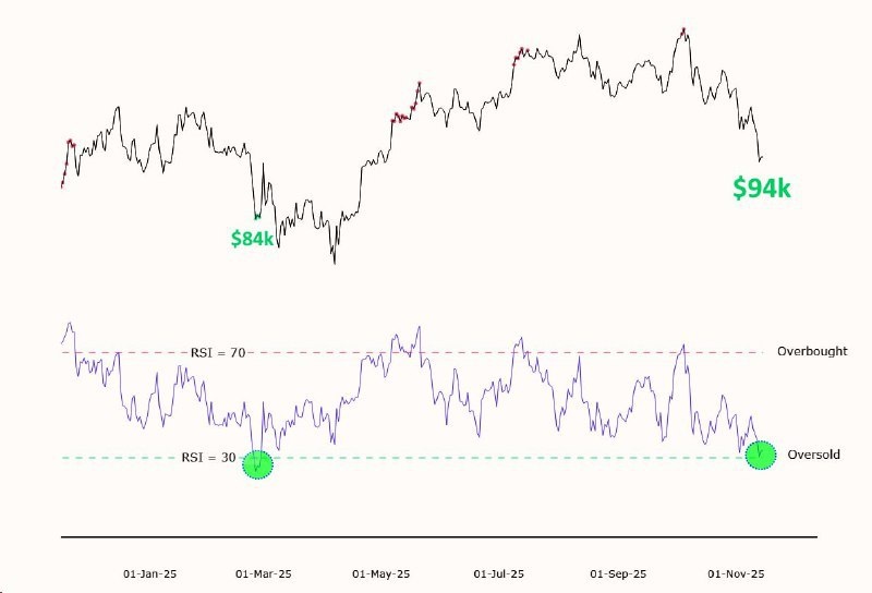 Bitcoin в зоне перепроданности 📉 — быки надеются на отскок до $135K 🚀 Bitcoin вошел в зону перепроданности по индексу RSI, который сейчас находится на уровне 36-47. Текущая цена BTC составляет около $96,000, что ниже важной 365-дневной скользящей средней. Исторически такие уровни RSI предшествовали отскокам на 15-25% в течение нескольких недель. Инвесторы надеются на повторение сценария и рост до $135,000, но рынок остается в состоянии консолидации между $106,000 и $118,000. Индекс страха и жадности показывает экстремальный страх, что часто является сигналом для разворота. #новости #БезПафосаФинансы #криптовалюты #инвестиции