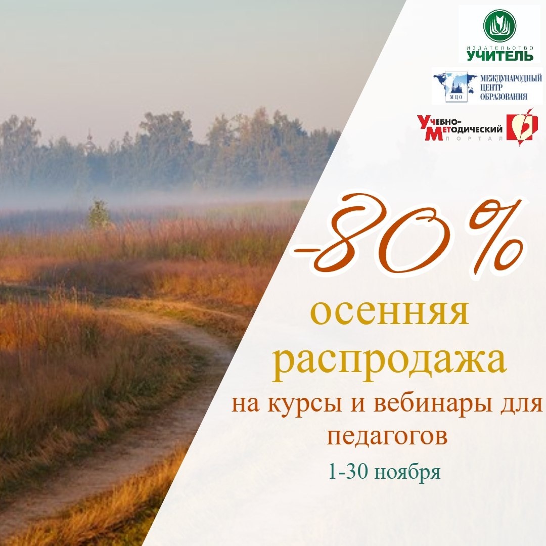 С 1 по 30 ноября 2025 года Издательство «Учитель» и Международный центр образования и социально-гуманитарных исследований проведут акцию «Осенняя распродажа». В этот период курсы и вебинары будут доступны со скидкой 80%. https://www.uchmet.ru/campaigns/3995348/