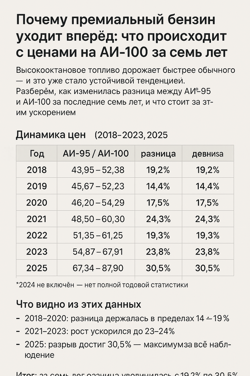 АИ-95 — 67,34 ₽/л, АИ-100 — 87,90 ₽/л. Разница: 30,5%. 👉 2024 год пропущен — нет полной годовой статистики. Итог: за семь лет разница увеличилась почти на треть. 1. Более сложное производство.
