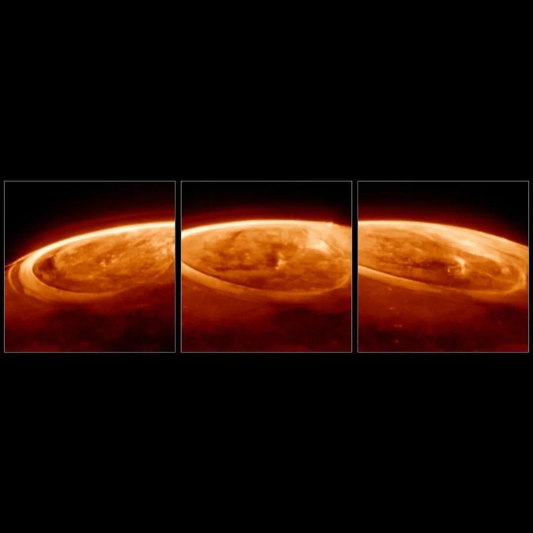 Изображения северного полюса планеты Юпитер, полученные телескопом NASA/ESA/CSA James Webb Space Telescope, показывают феноменальные детали её полярных сияний, которые в сотни раз ярче, чем земные северные огни. Эти сияния возникают из-за взаимодействия высокоэнергетических частиц солнечного ветра и частиц, выброшенных вулканом спутника Ио, с верхними слоями атмосферы Юпитера, направленными магнитным полем планеты к её полюсам. Наблюдения велись в инфракрасном диапазоне с помощью прибора NIRCam телескопа Джеймса Уэбба, а также одновременно использовались ультрафиолетовые данные с космического телескопа Хаббл. Это дало возможность увидеть неожиданные особенности, такие как ярчайшие участки сияния без видимого аналога в ультрафиолетовом диапазоне.
