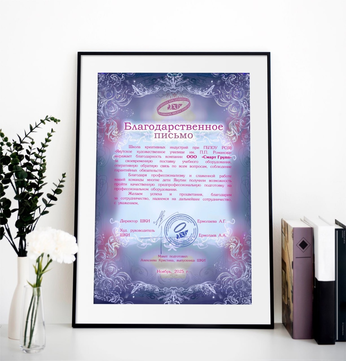 ❄️Благодарность из сердца Якутии Школа креативных индустрий при ГБПОУ РС(Я) «Якутское художественное училище им. П.П. Романова» выразила благодарность компании Смарт Групп 🙌 💡Благодаря профессионализму и слаженной работе нашей команды, юные таланты Якутии теперь учатся и творят на современном профессиональном оборудовании. 🔥 Для нас важно не просто выполнять задачи — мы создаём возможности для будущего поколений, помогая раскрывать их потенциал. ❤️Благодарим за доверие и продолжаем двигаться дальше! Telegram▫️VK▫️RuTube▫️Дзен▫️vc.ru #Обратная_связь