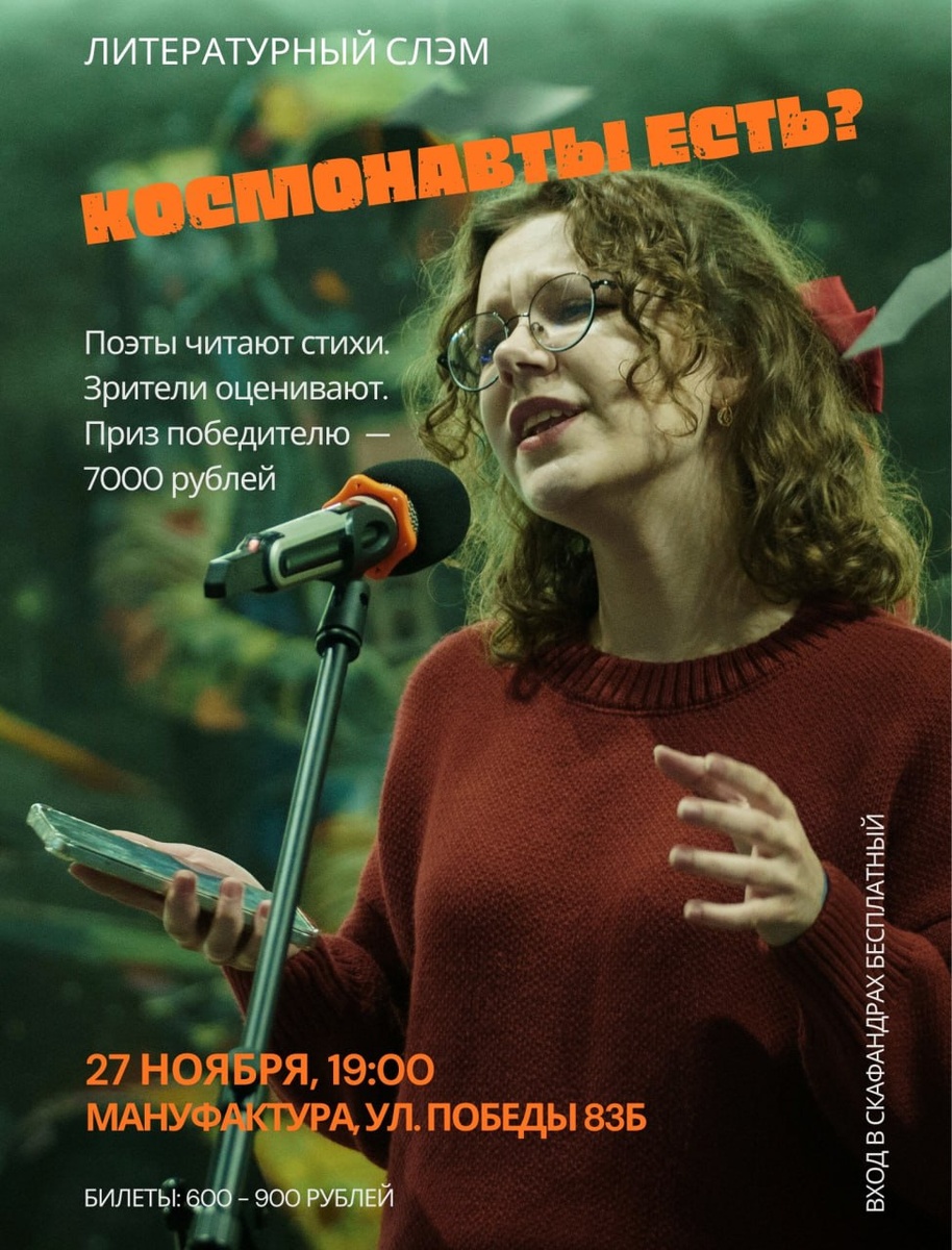 Литературный слэм «Космонавты есть?» ✨ #идёмплатно 27 ноября в 19:00 в арт-пространство «Мануфактура» по адресу: г. Белгород, ул. Победы, 83Б ➡️ Регистрация по ссылке Напомним, литературный слэм — это поэтический вечер в формате конкурса. Участники читают свои стихи со сцены. Случайные зрители их оценивают. ✏️ О правилах: каждому участнику предоставляется 3 минуты для чтения своих произведений в каждом раунде. Оценки выставляют по двум критериям: «текст» и «подача». Финалисты за 15–20 минут пишут экспромт на выбранную залом тему. Итоги конкурса определяют аплодисменты и эмоции зрителей. 🏆Приз победителю – 7 тысяч рублей! Не забудьте подписаться на наш канал❤️