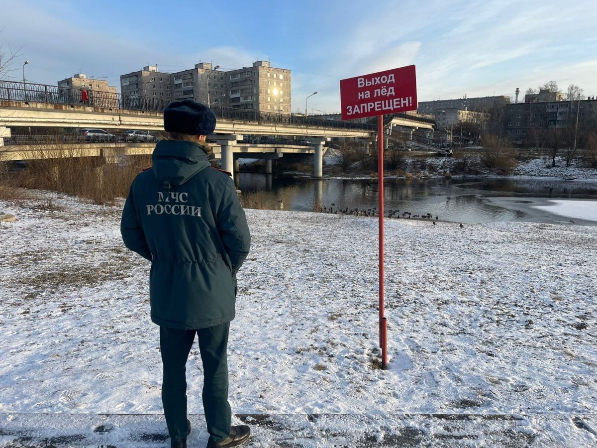 Сотрудник 13 пожарно-спасательной части 9 пожарно-спасательного отряда проводят профилактический рейд в связи с появлением льда на водоемах