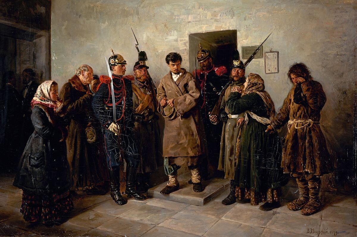 - Трагедия Веры: Молодой интеллигент, «народник», арестован за попытку просветить крестьян. Он стоит, еще не сломленный, но его глаза выдают обреченность.