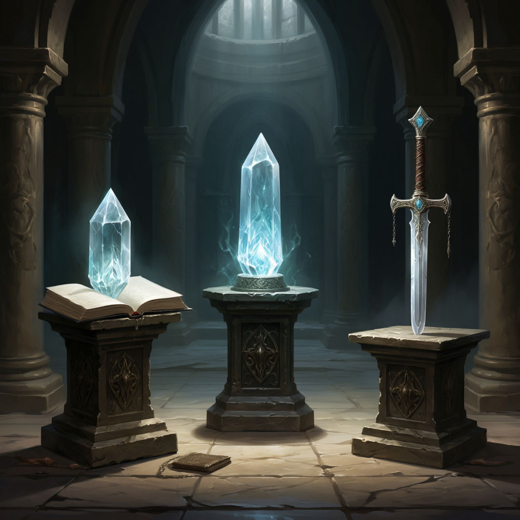 Олег огляделся по сторонам. На одном из постаментов лежал древний свиток, на другом — странный кристалл, излучающий мягкое сияние, третий хранил старинный меч с витиеватой гравировкой, а четвертый — небольшой амулет на цепочке из неизвестного металла. Олег понимал, что каждый из этих предметов несет в себе особую силу и предназначен для определенной цели.