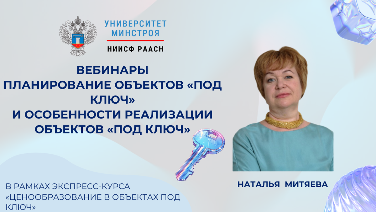 🆙 СЕГОДНЯ В 10:00 СТАРТУЕТ СЕРИЯ ВЕБИНАРОВ ПО ЦЕНООБРАЗОВАНИЮ УНИВЕРСИТЕТА МИНСТРОЯ НИИСФ РААСН ➡️ Сегодня Университет Минстроя НИИСФ РААСН открывает серию вебинаров экспресс-курса «Ценообразование в объектах под ключ: полный цикл реализации» ✔️ Первая встреча «Планирование объектов «под ключ» — состоится с 10:00 до 12:00 (по Мск) и будет посвящена основам формирования стоимости и структуры инвестиционного проекта на старте. 🎤 Вебинар проведёт Наталья Борисовна Митяева, эксперт Университета Минстроя НИИСФ РААСН по ценообразованию, сметному нормированию и аудиту, независимый эксперт НО ТЦА, член экспертной группы Комиссии по ценообразованию и ТЦА при Общественном совете Минстроя России, преподаватель кафедры «Экономика и управление в строительстве» ГУУ 💬 В рамках занятия слушатели разберут ключевые принципы планирования объектов «под ключ» и последовательность действий, позволяющих сформировать корректную модель проекта ещё до выхода на заключение контракта 🎯 Особое внимание бу