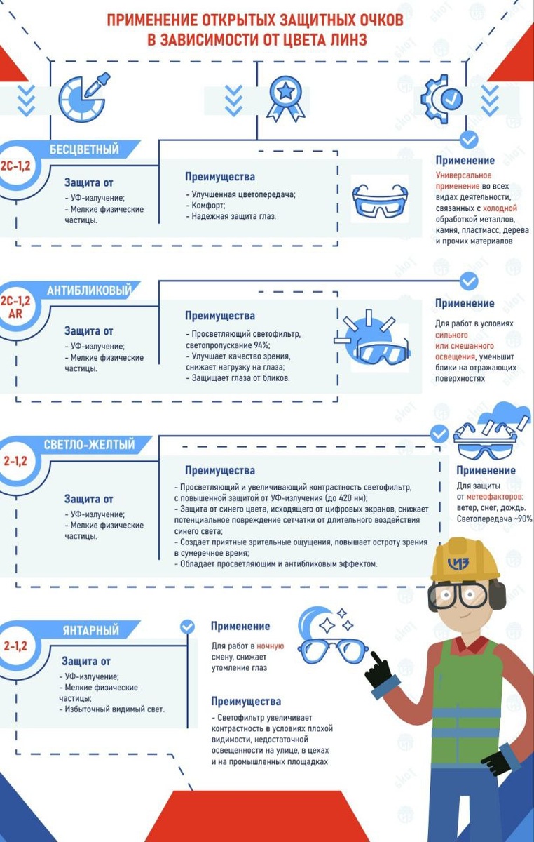 Ловите очередную порцию инфографики! На этот раз решили провести ликбез по защитным очкам! Весьма полезное знание не только для работы, но и для отдыха. Открытые защитные очки предохраняют глаза как от пыли, осколков, брызг жидкостей, так и от электромагнитного и светового излучений. Выбор цвета таких очков - важный фактор, потому что каждый оттенок придает линзам определённые защитные свойства. С этой "шпаргалкой" проще выбрать очки под Ваш вид деятельности.