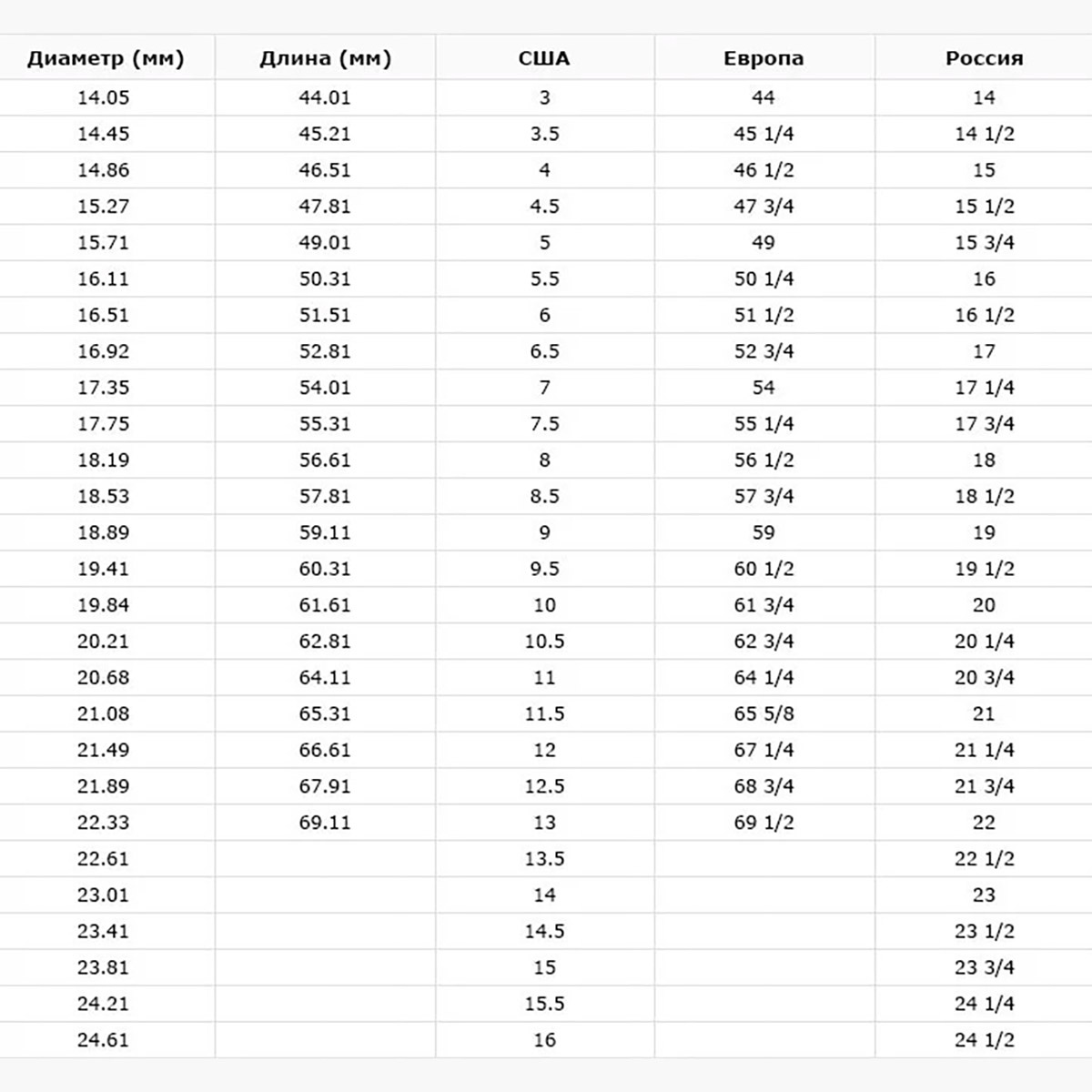 В некоторых зарубежных странах используют другую систему измерений. Учтите это, если решите заказать украшение на иностранном сайте. Обычно на страничках ювелирных магазинов есть таблицы соответствия размеров. Если вы знаете размер по российской системе, то его можно сопоставить с другими данными.