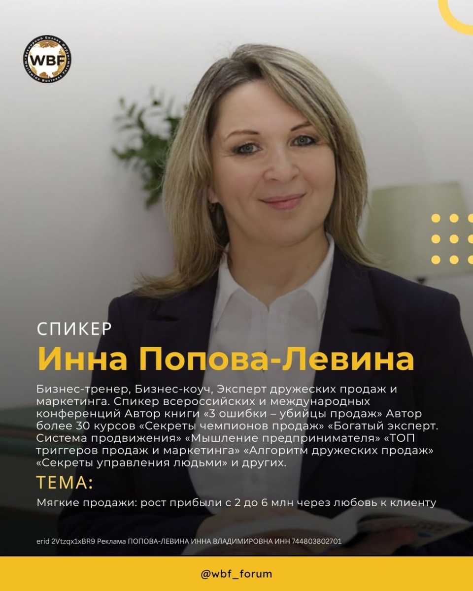 🎙В ЭФИРЕ ИННА ПОПОВА-ЛЕВИНА - Бизнес-тренер, Бизнес-коуч, Эксперт дружеских продаж и маркетинга Спикер всероссийских и международных конференций. Обучает продавать легко много и дорого, в первую очередь тех, кто не хочет навязываться, быть агрессивным и давить на боль. Помогает экспертам, предпринимателям и их командам освоить техники дружеских продаж, где главное – это помочь клиенту найти оптимальное решение его задач, через ценности и результаты вашего продукта. Дает инструкции как привлекать клиентов не вкладывая в рекламу. 25 лет опыта личных продаж. Предприниматель с 2000 года. 15 лет ведет мастер-классы, консультации, тренинги на аудиторию до 600 человек. Более 5000 отзывов клиентов со всей России и СНГ. Результаты клиентов - рост продаж на 25%-100% и более. Автор книги «3 ошибки – убийцы продаж» Автор более 30 курсов. ➡️ ТЕМА: Мягкие продажи: рост прибыли с 2 до 6 млн через любовь к клиенту