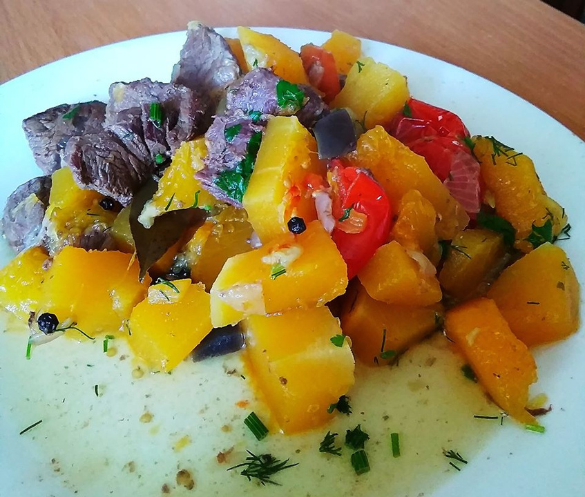 ✔ Тыква - 300 г; ✔ Помидоры - 2 шт.; ✔ Перец - 1 шт.; ✔ Лук репчатый -1 шт.; ✔ Баклажан - 1/4 шт. (у меня – мороженый, из запасов); ✔ Зелень – по вкусу; ✔Соль, специи – по вкусу; ✔ Телятина-500 г; ✔Вода – 2 л для варки мяса, 150 мл для тушения овощей. Овощи почистить, нарезать, сложить в сотейник или глубокую сковороду, посолить-поперчить, добавить 150 мл воды и тушить под крышкой на слабом огне ~30 минут. Телятину зачистить от пленок, залить водой. Варить после закипания 1 час. Из бульона и мяса, которое осталось, варю суп семье. Порция на ужин: овощи - 300 г, мясо - 200 г. КБЖУ тушёных овощей (на 100 г) - 28/1,1/0,3/17,3. КБЖУ варёной телятины (на 100 г) – 112/20,5/3,2/0. КБЖУ порции ужина – 308/44,3/7,3/17,1. Рецепт на странице Автор рецепта – Оксана Щеголькова Расчёт КБЖУ сделан с помощью Telegram-чат-бота https://t.me/vesipitaniebot © Почтенный возраст Online и Рецепты для диабетиков