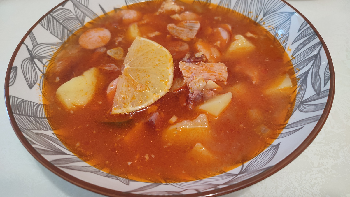 Всем приветик, мои дорогие 🤗. Выходные прошли, и впереди рабочие будни. Совсем не нравится мне это, ну ничего не поделаешь. Я уже говорила, что с заявками то густо, то пусто. Ещё этот отпуск... Итак, понедельник и вторник работаю с 13 и с 12 часов дня. Перед работой конечно же не хочется возиться на кухне. Вот, например, сегодня, сначала поехали с мужем за покупками, потом готовила на два дня, потом на работу пошла с 16. Была уставшая, хотелось просто лежать. Ноо, так как мне только к 16, почему бы не приготовить на два дня сразу? Хотя бы на сегодня, и завтра. А во вторник разберёмся, что будем есть. Сын несколько раз просил солянку. Так и сказал, что готовим мы её редко. По солянке у нас спец- муж. Ею занимался он. Для этого отварили мясо- свинину, потому что говядины не было, а курица ещё не разморозилась, мы её только купили. Всё нужное для солянки купили ещё в субботу. Положим туда сосиски, копченые ребра, картошку, карнишоны. Муж сначала всё обжарил на сковороде, с добав