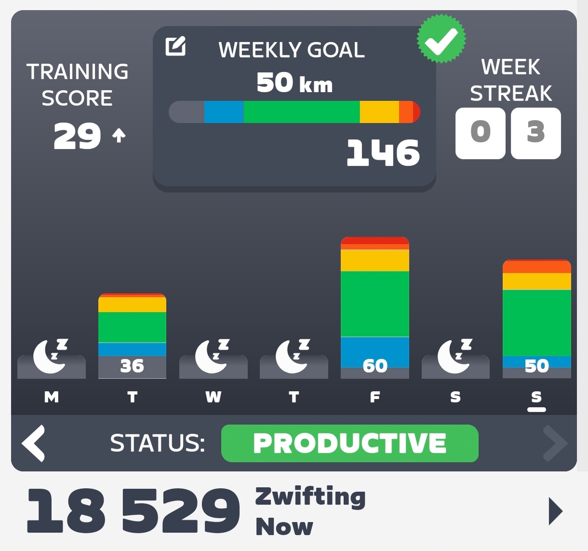 Всем привет! Неделя выдалась неплохой, и вот её результаты... Хорошо мотивирует видимый финиш прокачки трёх велосипедов ZWIFT. Истории, которая началась довольно давно, после того, как я понял (перевел надпись на экране 😁), что для того, чтобы, улучшить один из главных трофеев этого велосимулятора светящийся Tron Bike, необходимо сначала до максимального пятого уровня прокачать три любых (на свой выбор) велосипеда ZWIFT. И вот они почти готовы. Я на финишной 🏁 прямой, и осталось около 170 километров. Возможно ближе к концу следующей недели доеду это расстояние. Посмотрим на то, какое будет самочувствие и найдётся ли необходимое для этого время. Зачастую именно время является ключевым фактором.