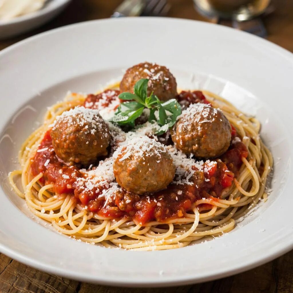 Спагетти с мясными котлетами и томатным соусом