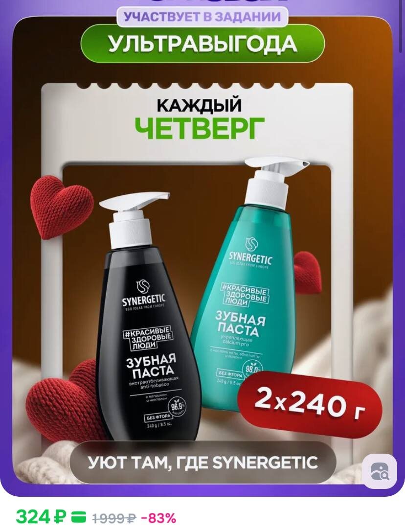 Зубная паста с дозатором SYNERGETIC (экстра отбеливающая ANTI-TOBACCO + укрепляющая CALCIUM PRO), 2 х 240 г. https://ozon.ru/t/dQJ14PH ✅ Подписаться 🔣 Бот с промокодами