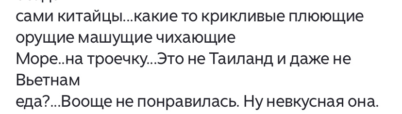 Выбирайте правильный отель, уважаемые россияне. И, что самое важное, выбирайте правильную бухту! Тогда Вы получите удовольствие и напишите только хорошие слова о Хайнане. Привет, с Вами Елена! Не соглашусь с комментатором. Хотя мы все разные! Но, правда, как такое море можно назвать морем на троечку? И вот с таким рассыпчатым песком? Без водорослей, без мусора. Немного с ракушками и камешками на песке. С пологим входом! Люди точно разбираются в море? Думаю, Читатель просто НЕ там отдохнул! Итак, сдаю Вам явки и пароли! Выбирайте правильную бухту! Бухта Ялонг Бей или Ялуньвань. Отель Расположен НЕ на первой береговой линии, а примерно в 500 метрах от пляжа. 500 метров не напрягают вообще, это в обход. Гораздо проще пройти через территорию отеля-брата Hualuxe Sanya Yalong Bay Resort 5*. Это займёт минут 10 неспешным шагом, и Вы на прекрасном песчаном пляже. Кстати, территорией отеля-брата, его бассейнами и услугами можно пользоваться бесплатно! И анимационными программами. С утра п