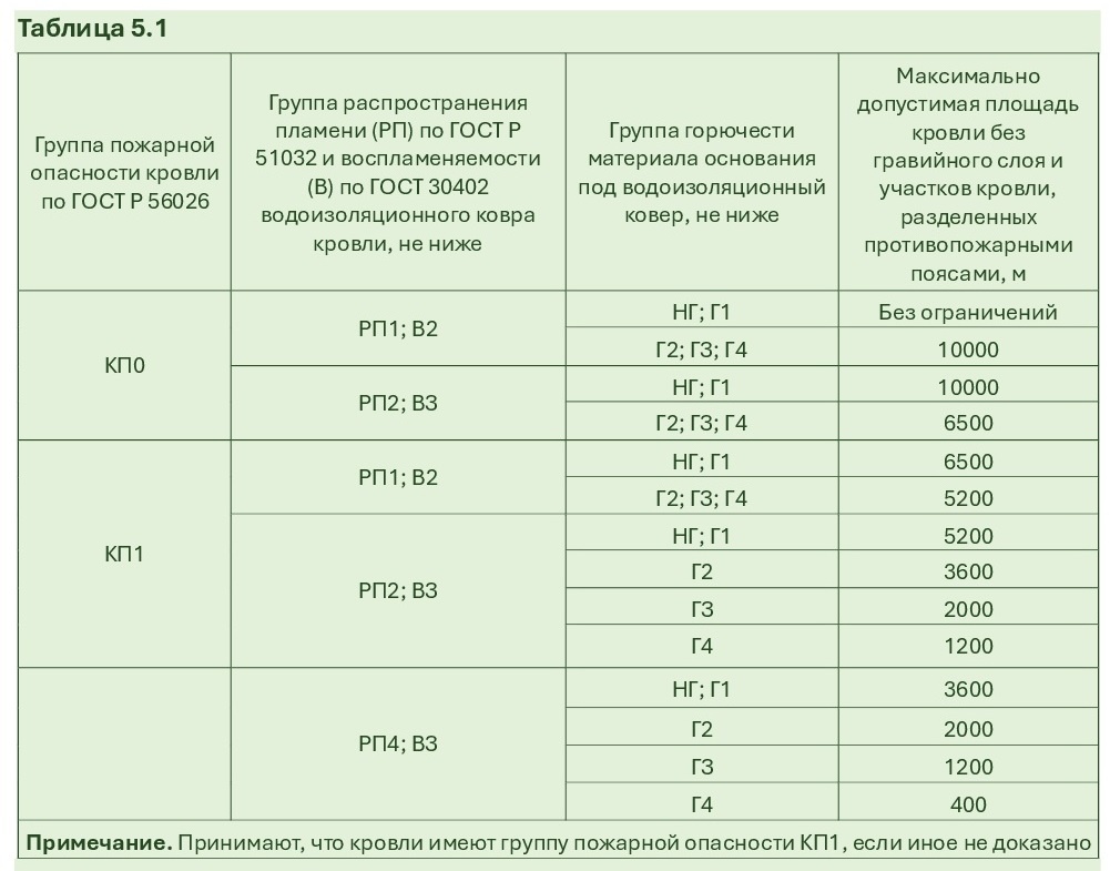 из рулонных и мастичных материалов, не имеющей защиты из слоя гравия, а также площадь участков, разделенных противопожарными поясами, не должны превышать значений, приведенных в таблице 5.1 настоящего свода правил.