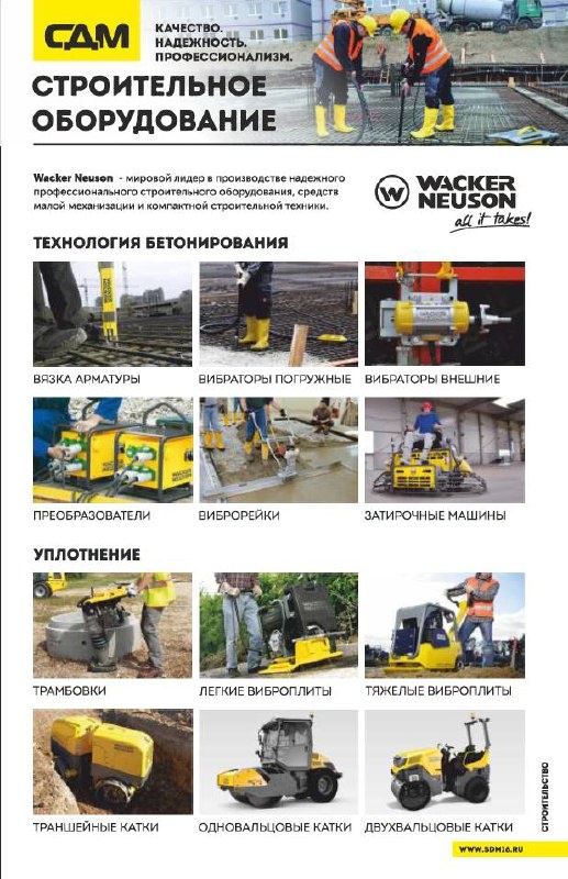 #СДМНОВОСТИ Мы предлагаем вам стать нашими клиентами и приобрести высококачественное строительное оборудование малой механизации для реализации ваших проектов в сфере строительства зданий и дорог, а также для оказания услуг в области коммунального хозяйства. В нашем ассортименте вы найдёте: * вибраторы для уплотнения бетона — обеспечат высокое качество укладки и уплотнения бетонных смесей, что позволит повысить прочность и долговечность конструкций; * виброплиты и вибротрамбовки — незаменимы при укладке тротуарной плитки, уплотнении грунта, подготовке оснований под фундаменты и другие работы; * генераторы и миниэлектростанции — надёжные источники электроэнергии, которые обеспечат бесперебойную работу вашего оборудования даже в удалённых районах без доступа к централизованным электросетям; * садово-парковое оборудование — поможет в уходе за территориями, благоустройстве парков и садов, создании комфортных условий для отдыха и проживания; * компрессорные станции и дизельные компрессоры
