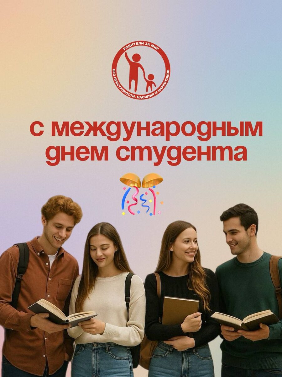 С праздником Международного дня студента! 🥳 🥳🥳 Поздравляем с Международным днём студента — праздником молодости, стремления к знаниям и веры в лучшее будущее! Вы — поколение, которое уже сегодня формирует завтрашний мир. 🧠Ваши идеи, энергия, смелость и желание развиваться делают общество сильнее, мудрее и гуманнее. Мы ежедневно работает над тем, чтобы создать условия для безопасной, сознательной и сильной молодёжи. 🎯 Наша миссия — делать будущее поколения лучше, поддерживать вас в вашем выборе здоровой, активной и честной жизни, где нет места разрушительным привычкам и рискам. Мы верим в вашу силу менять мир. 🤗 Пусть каждый день учёбы приносит вам новые знания, яркие открытия, надёжных друзей и уверенность в собственных способностях! 🤗 С заботой, Центр «Родители за мир без преступности, насилия и наркотиков».