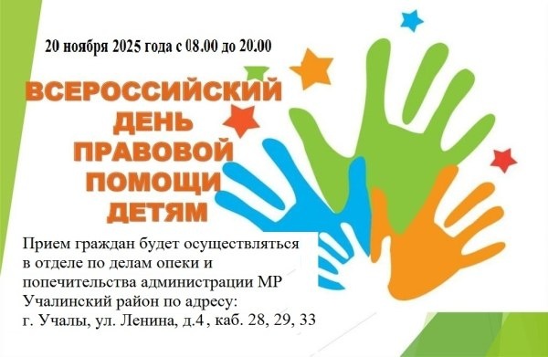 В соответствии с Федеральным законом от 21 ноября 2011 года 324 ФЗ «О бесплатной юридической помощи в Российской Федерации», а также во исполнение письма Управления Министерства юстиции Российской Федерации по Республике Башкортостан от 31 октября 2025 года, в отделе по делам опеки и попечительства администрации муниципальный район Учалинский район Республики Башкортостан 20 ноября 2025 года пройдет Всероссийский день правовой помощи детям. Также для граждан, желающих принять ребенка в семью, кандидатов в усыновители или опекуны, будет организован День открытых дверей «Рожденные сердцем». 20 ноября с 8 до 20 часов (обед с 13 по 14) по адресу: г. Учалы, ул. Ленина, д. 4, каб. 28, 29, 33 специалистами отдела по делам опеки и попечительства проводится прием граждан по правовому информированию и просвещению детей и их родителей, усыновителей и опекунов, в формате личного приема и консультирования граждан по интересующим вопросам.… https://uchaly102.ru/?p=111149