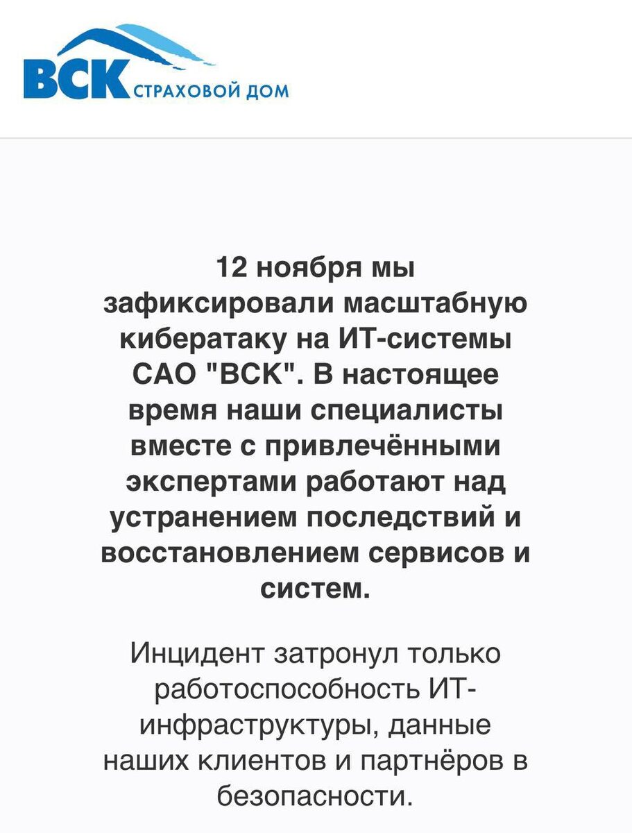 С 12 ноября на сайте ВСК висит одна и та же надпись ⬆️ Так же повреждён домен ТГ канала он ведёт на мошеннический канал. Сайт не открывается, приложение "молчит", личный кабинет недоступен. Причина — масштабная кибератака. ВСК официально заявили, что специалисты сейчас в авральном режиме восстанавливают IT-инфраструктуру. ⚠️ Важно: данные пользователей, по словам компании, не пострадали. Но факт остаётся фактом: ❌ оформить новый полис нельзя, продлить старый - тоже. Этим скорее всего могут воспользоваться мошенники. Если вам приходят сообщения со ссылками от компании ВСК - ⚠️ не переходите по ссылке и ничего не оплачивайте. Галина Робертовна - Специалист по страхованию 🍀