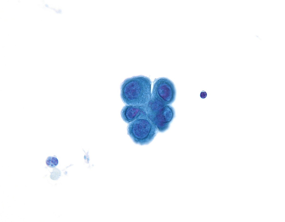 Метастатическая аденокарцинома легкого Размер клеток — важнейший диагностический критерий при выявлении метастатического поражения в спинномозговой жидкости. Для корректной оценки необходимо проводить сравнительный анализ с размерами лимфоцитов (фото 1) или эритроцитов (фото 2). Окрашивание по Папаниколау. Объектив 100x. Препарат получен методом центрифугирования. #цитология #цитологияжидкостей #смж #легкое