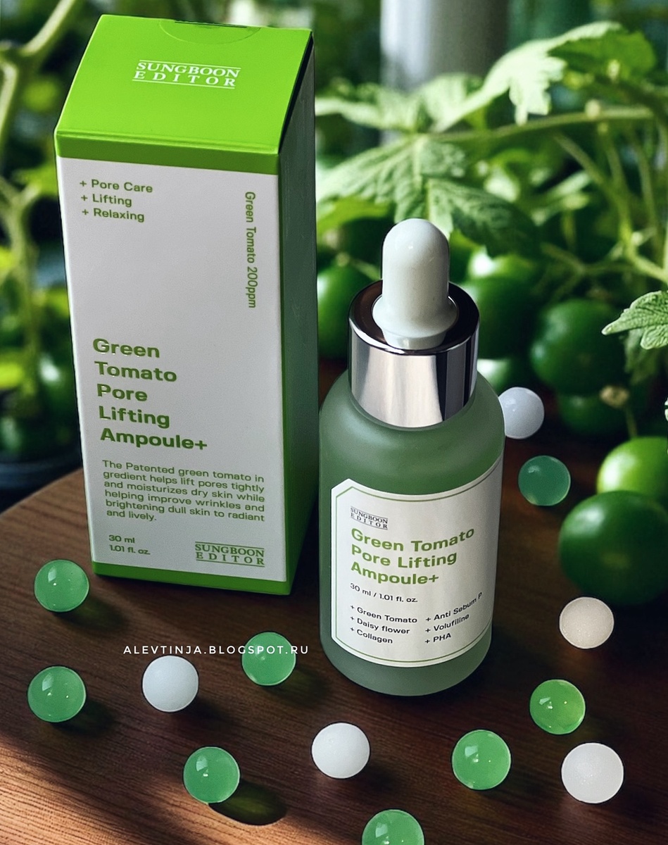 захотелось её тоже. А кто не захочет уменьшить размер пор? Так стоит ли она хайпа? Расскажу. - в ЛЭтуаль - на джуме (очень выгодный набор с бесплатной доставкой из Кореи) - в холлишоп (скидка 10% на весь заказ по промокоду OHMYWISHES) на iHerb* - Sungboon Editor, сыворотка с зеленым томатом, для сужения пор, 30 мл (1,01 жидк. унции) * Скидка 20% на косметику по промокоду NOV25BBPC Сыворотка призвана улучшать текстуру кожи, сужая поры. Причём, сужать эти самые поры она должна не старомодным способом за счёт кислот, а с помощью компонентов, которые дают лифтинг эффект, тем самым подтягивая даже возрастные поры, утратившие упругость и подрастянутые силой земного притяжения. Смотрите, что тут у нас в составе. Во-первых, экстракт зелёных томатов - природный антиоксидант. Он содержит томатидин, который улучшает эластичность кожи и делает поры менее заметными. Кроме того, он осветляет кожу, насыщает её витаминами и даже