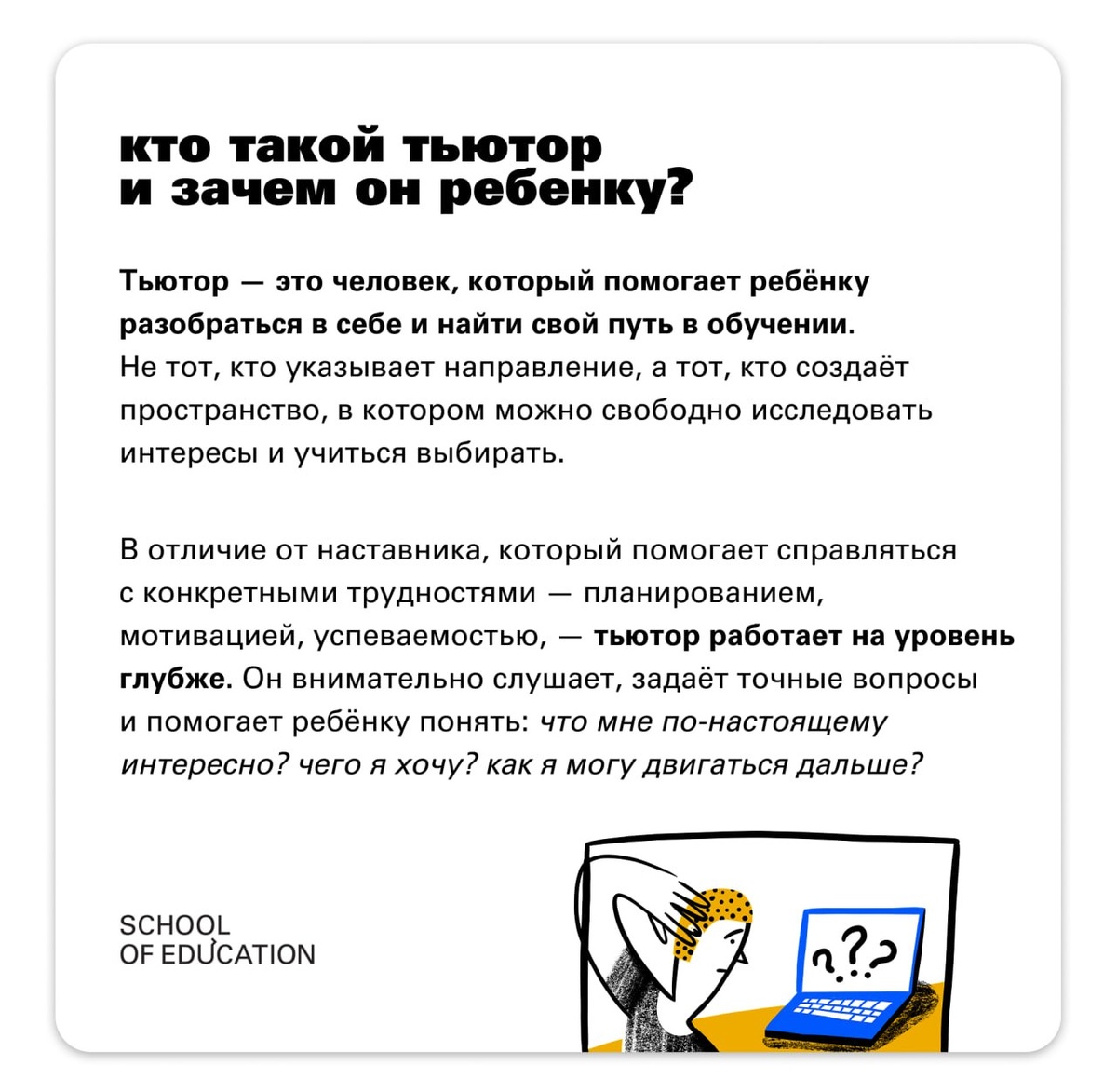 Кто такой тьютор и зачем он ребенку? Современные учебные заведения все чаще стремятся создать условия, в которых процесс обучения будет максимально отвечать потребностям ученика, — и тут на помощь приходят тьюторы. ➡️ Что это за профессия и как она помогает детям преодолеть трудности в обучении, кратко объяснили в карточках. А освоить тьюторское мастерство приглашаем на программе «Индивидуальное тьюторское сопровождение» — будем говорить не только о практических навыках, но и о философии тьюторства, и почему тьютор в России — редкая роль. 💙 Присоединяйтесь!