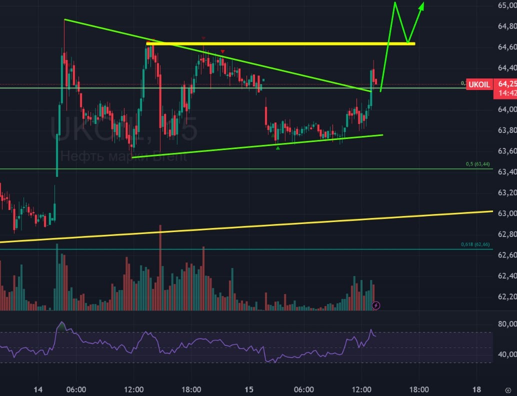 🛢 Нефть 🟢 Актив сложный. Прошлую структуру отработали по самому простому варианту, после чего произошел отбой от ближайшей поддержки. 🟢 Предположу и дальнейших ход движения по самому простому варианту. У нас есть вот такой флаг на 15-минутке, из которого есть выход вверх. В этом случае, если он существует, то цена должна пробить локальное сопротивление 64,60, и отправиться на верхнюю границу большого накопления 65,17. 🚗 Выход из большого накопления жду вверх. Но необходимо страховаться стопами. #Нефть #Brent #BR #bogdanoffinvest