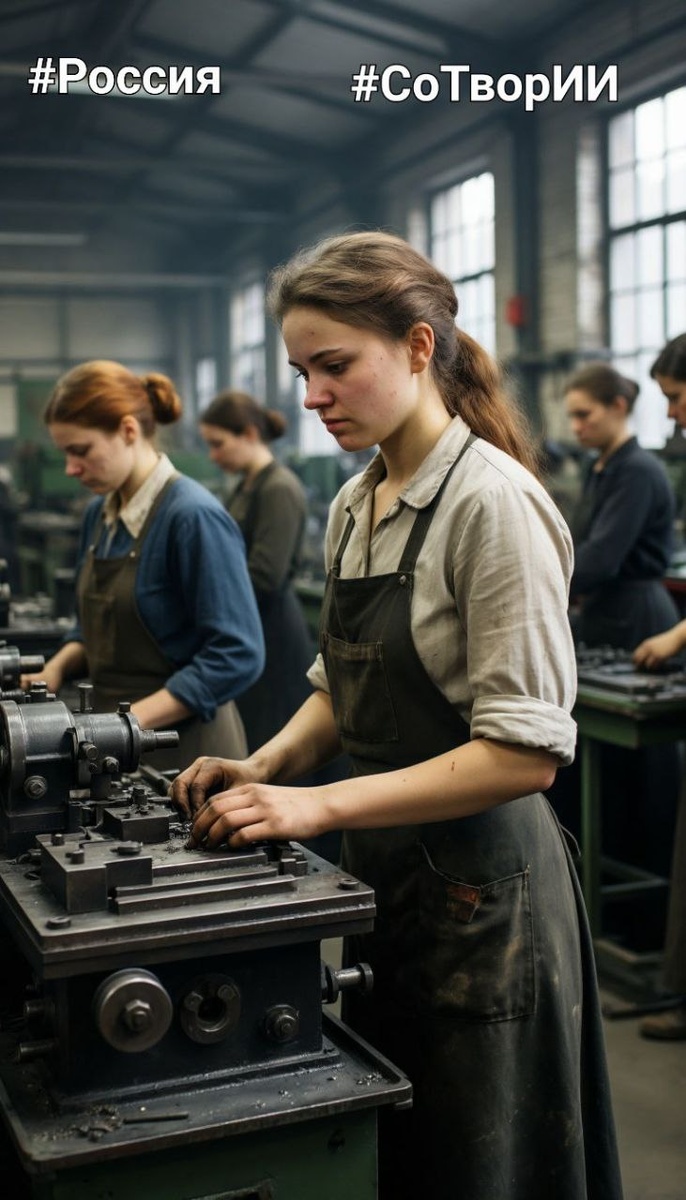 Тыл - фронту Историческая память: женщины и дети у станков 💪 "Всё для фронта, всё для победы!" - этот лозунг стал смыслом жизни для миллионов в тылу. Женщины, подростки, старики - они работали по 12-14 часов в сутки, спали у станков. Заводы эвакуировались на Урал, в Сибирь, и через недели начинали выпускать продукцию для фронта. Танк Т-34, собранный женщинами на Уралмаше, самолет, собранный подростками в Омске, снаряды, отлитые в Челябинске - это был настоящий трудовой подвиг. Мы помним не только солдат, но и тех, кто ковал победу в тылу, кто голодал, но отправлял посылки на фронт, кто верил и ждал. Нейросеть показала, как выглядел героизм в рабочей спецодежде. #Россия #СоТворИИ #ИсторическаяПамять #ТрудовойФронт #Тыл