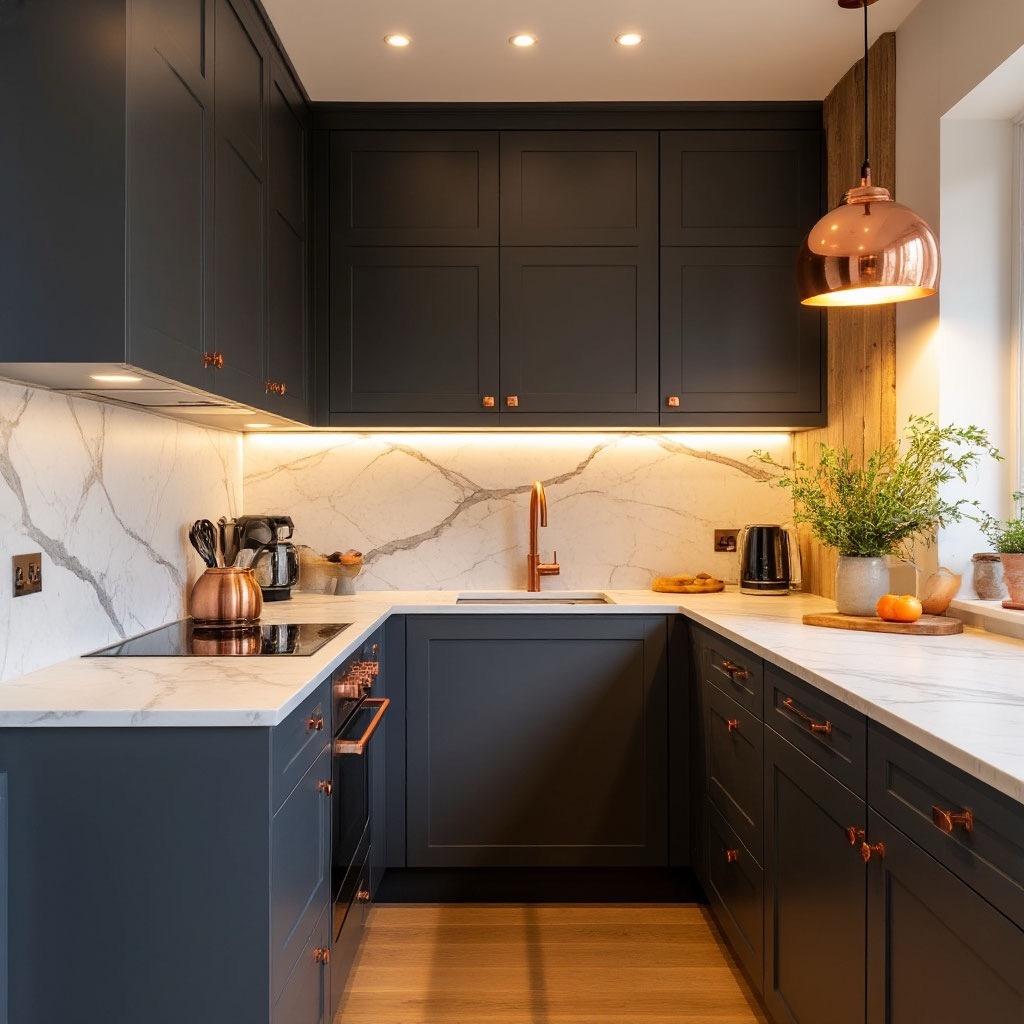 — Скажите честно: белый — это действительно безопасный вариант или скука на годы? — Белый безопасен как вода. Но кухня — это не галерея, а рабочее пространство. Цвет должен скрывать пятна, поднимать настроение в семь утра и не надоедать через полгода. 1. Темно-серый (шиферный) — новый черный Почему работает: · Маскирует следы пальцев и брызги жира · Создает глубину в маленьком пространстве · Сочетается с любым текстурами: дерево, камень, металл Где использовать: · Нижние шкафы + столешница под бетон · Фартук из матовой керамики · Акцентная стена в обеденной зоне Осторожно: В северных комнатах добавляйте теплый свет (2700К) и медные ручки. 2. Оливковый — уют без крика Психология цвета: · Снижает тревожность на 18% (исследование Color Research Center) · Не режет глаз утром · Ассоциируется с натуральностью и спокойствием Идеальные партнеры: · Дуб светлый или ясень · Латунная фурнитура · Бежевый гранит или кварц Фишка: Оливковые нижние шкафы + белые верхние = иллюзия высо