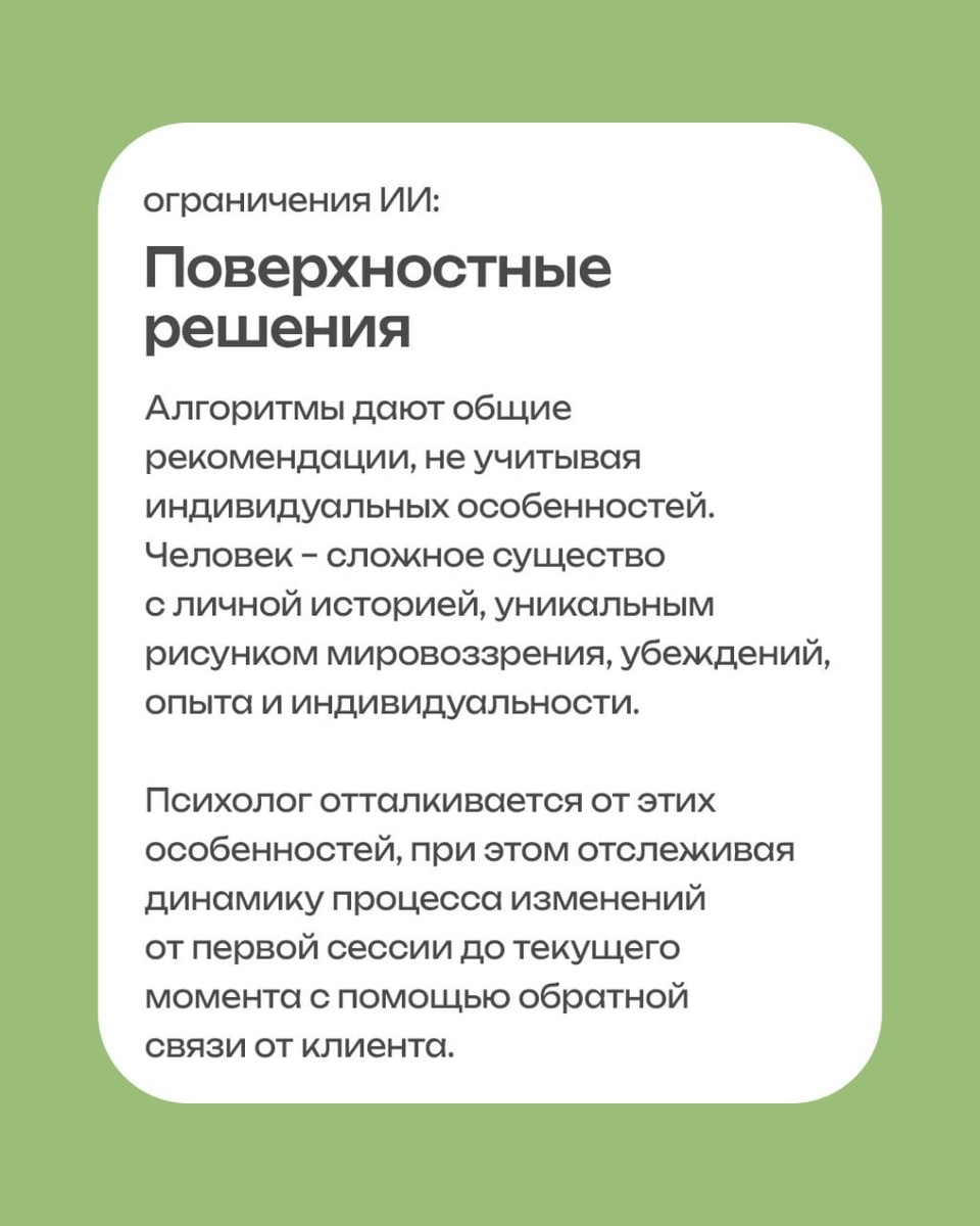 Искусственный интеллект и чат Gpt. Я встречаю клиентов и слышу от коллег- психологов, что сначала многие пытаются сами решить проблемы. Очень часто решение ищут последнее время уже даже не у родных и друзей, а у ИИ и чата Gpt. В карточках коллеги из Be CBT написали ограничения ИИ. У меня один клиент сообщил, что обращался за помощью к чату Gpt и я была удивлена, когда в одной из первых рекомендаций было - обратитесь к психологу. ❗При взаимодействии с Gpt сейчас наблюдается такое явление как "эхо-камера". Как это проявляется: Человек обращается за помощью и ему выдаются ожидаемые/ желаемые слова. Человека поддерживают в его словах и мыслях, его состоянии, что усугубляется еще больше, имеющиеся мысли подтверждаются. Психическое состояние ухудшается, мысли подтверждаются о тревоге, страхе, суициде. ❗Особенно опасна такая " поддержка" при тяжёлой депрессии, мании, психозе и т.д. ❓А вы обращаетесь к ИИ за советом? В какой ситуации вы предпочтёте обратиться к психологу? #ИИ #ч