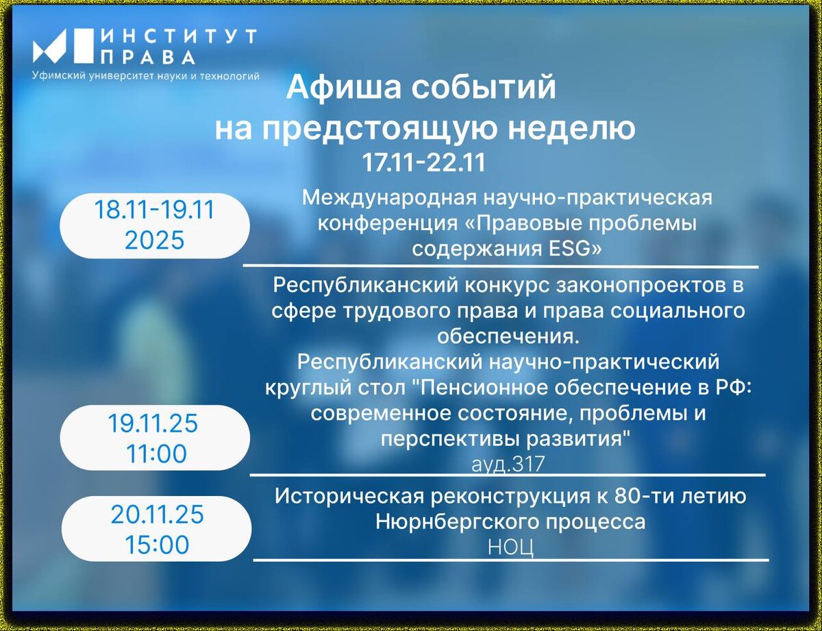 📣 АФИША СОБЫТИЙ 🗓 18–19 ноября 2025 г. Международная научно-практическая конференция «Правовые проблемы содержания ESG» В рамках конференции будут организованы три секции: 18 ноября - секция по корпоративному управлению (G) в ауд. 317, 19 ноября - секция по экологии (E) в ауд. 302 и секция по трудовому праву и социальной политике (S) в ауд. 317. Начало всех секций в 9:00 по московскому времени. 🗓 19 ноября 2025 г. 📍 Одновременно пройдут два мероприятия в 11:00 (время - уфимское) в 317 ауд.: 🔹 Республиканский конкурс законопроектов в сфере трудового права и права социального обеспечения 🔹 Республиканский научно-практический круглый стол «Пенсионное обеспечение в РФ: современное состояние, проблемы и перспективы развития» 🗓 20 ноября 2025 г. 📌 На базе Научно-образовательного центра (НОЦ) в 15:00 🎭 Историческая реконструкция К 80-летию Нюрнбергского процесса Погрузитесь в эпоху, ставшую поворотной в истории международного права!