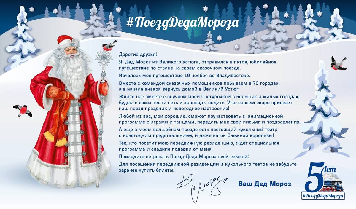 Поезд Деда Мороза 2025-2026! Дед Мороз совсем скоро отправится из Великого Устюга в дальнюю дорогу! Праздничное шествие по стране начнётся с Владивостока 19 ноября. Поезд проедет свыше 20 тысяч километров и посетит 70 городов с большими и малыми программами. Поезд Деда Мороза – это празднично оформленная передвижная резиденция, в составе которой вагон приемная Деда Мороза, вагоны для проведения анимационной программы, вагон-кукольный театр, вагоны-рестораны и вагон-лавка. Пассажиры этого поезда – сам Дед Мороз и его сказочная команда. В каждом городе, где сделает остановку Поезд Деда Мороза, посетителей вокзалов ждет детская анимационная программа с участием артистов, которая позволит окунуться в атмосферу зимней сказки. А в больших городах предусмотрена возможность посещения передвижной резиденции или кукольного театра (по заранее приобретенным билетам в соответствии с указанным в билете временем посещения). Ищите маршрут поезда в вашем городе. Билеты рекомендую приобретать только
