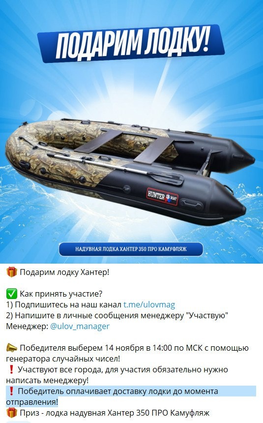 Всем доброго времени суток! Есть у меня хороший товарищ Владимир. Охотник, рыбак, таёжник до "мозга костей". В свободное время "юзает" по десяткам сайтов и форумов ориентированных на его хобби. На одном из сайтов заполнил он анкету и... "счастье ему привалило"! "Выиграл" он значит "лодку". Лодка красивая, мечта любого рыбака. Но, у парня "голова на месте", чувствует подвох. Позвонил, "радостью поделиться", да совета спросить. Я понимаю, что чудес за чужой счёт не бывает. У меня с ходу две версии возникли по поводу того, как его будут "лоховодить". Первая версия. Скажут, что он - "счастливчик! Он, якобы "прошёл жёсткое сито многотысячного отбора" и попал в финал. А финал, как-бы платный :) Вторая версия. "Лодку" надо будет ему выслать. А так как мошенникам надо человека лохонуть, то они скажут, чтобы он "пересылку" (возможно, вместе со "страховкой") им заранее оплатил. Понятное дело, никто никому ничего не вышлет! Тем не менее, какие-никакие деньги, но аферисты "состригут". С его слов